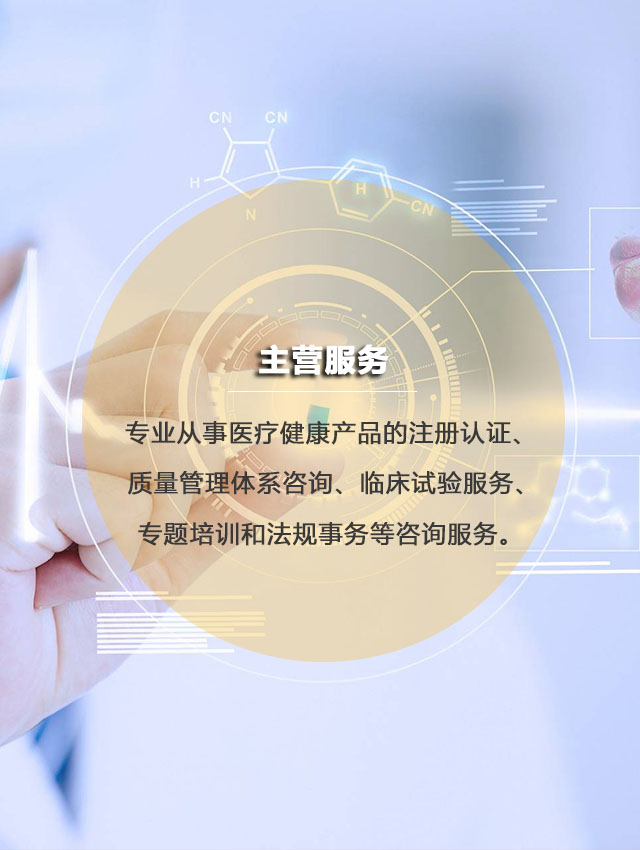 我们的主营业务涵盖I、II、III类医疗器械的注册认证、检测认证、质量管理体系咨询辅导、临床试验、专题培训和法规事务等咨询综合服务机构。我们有优秀的法规团队以及专业技术团队,可以为全球医疗器械企业提供产品上市前的一站式法规咨询以及技术服务,为医疗器械制造商提供证书申请服务,如NMPA、CE-MDR、FDA注册等,帮助产品顺利进入国际市场。